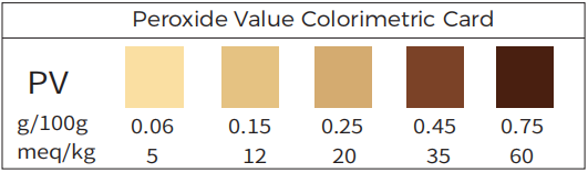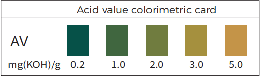 Reference to the colorimetric card, determine the AV and PV based on the color on the test area. If the color is between the adjacent colorimetric standards, then the average value is chosen.