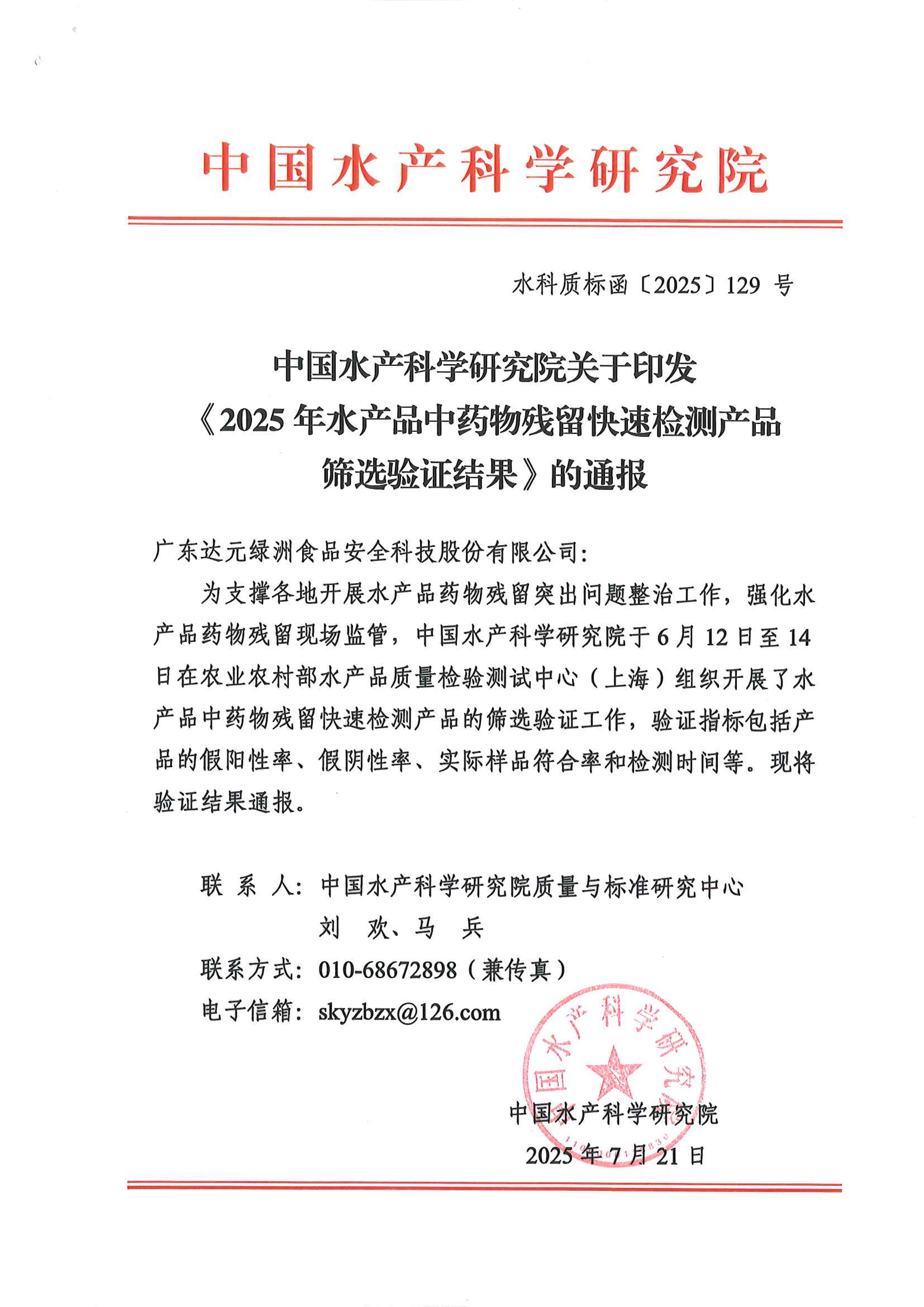 This marks the eighth consecutive year that Dayuan & Oasis FoodTech Ltd has successfully passed the China Academy of Fishery Sciences’ rigorous screening and validation for rapid detection products of drug residues in seafood products.