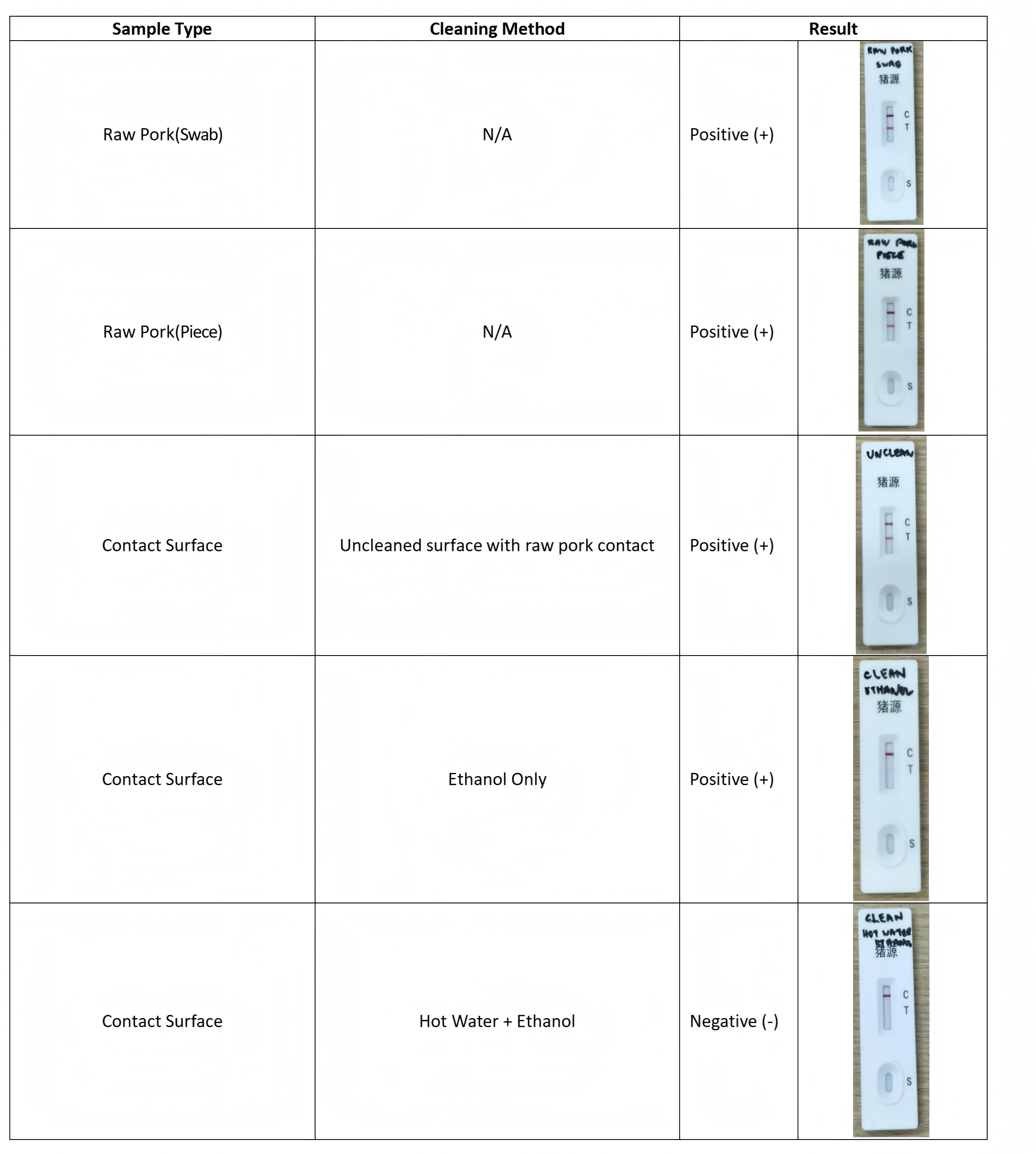 Positive (+): T line appears (porcine detected).