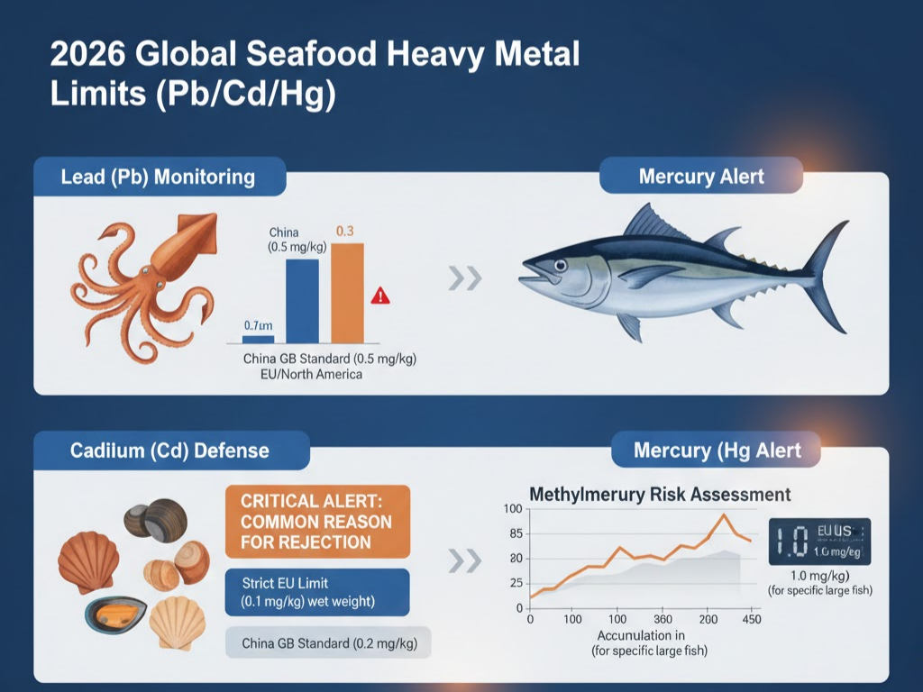 l Lead (Pb): Monitoring is focused on cephalopods like squid. While China’s GB standard permits 0.5 mg/kg, stricter markets require levels as low as 0.3 mg/kg.